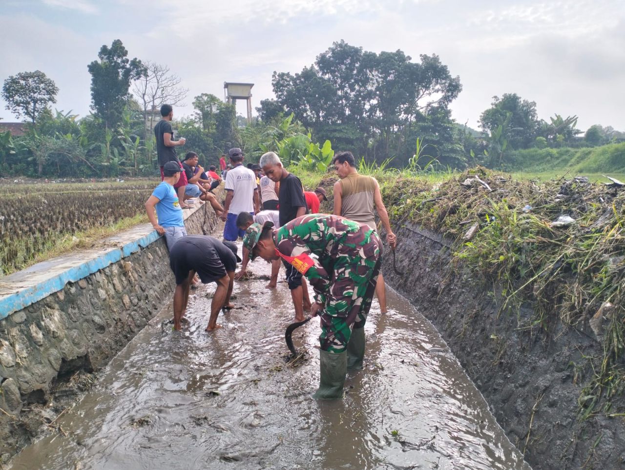 Babinsa Koramil Sananwetan Bersama Kelompok Tani Bersihkan Irigasi