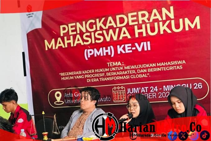 HarianMetro.co, POHUWATO – Fakultas Hukum Universitas Pohuwato kembali menggelar kegiatan Pengkaderan Mahasiswa Hukum (PMH) tahun 2025. Kegiatan ini secara resmi dibuka oleh Dekan Fakultas Hukum, Irwan, SH., MH., bertempat di Aula Gedung A Universitas Pohuwato, Jumat (24/10/2025).